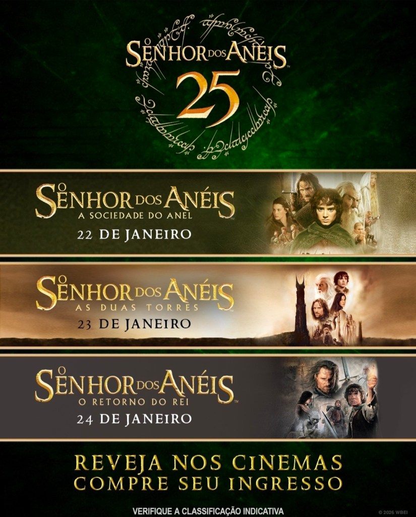 Os fãs da Terra-média terão a oportunidade de reviver uma das maiores sagas da história do cinema nas telonas. Em comemoração aos 25 anos de O Senhor dos Anéis: A Sociedade do Anel, a trilogia dirigida por Peter Jackson retorna aos cinemas brasileiros entre os dias 22 e 24 de janeiro, com exibições especiais da versão estendida.